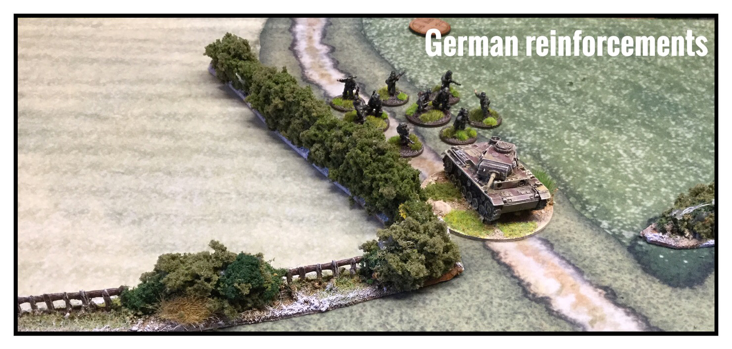 The pictures tell a little of the narrative of the game. British defence evenly across their own lines. German thrust down their right flank, lead by a PzIII. Firefights in the centre and left, with casualties mounting on either side. A gun duel between a deployed 6 pounder and PzIII, which lasted a couple of rounds, with the AT gun finally wining the contest. At this point the game was halted for the following week...